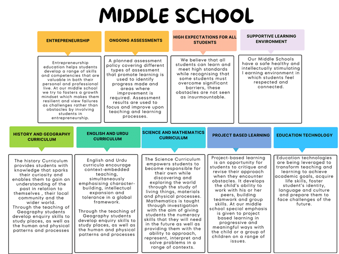 The Middle School program is designed to provide a strong academic foundation while fostering intellectual curiosity, discipline, and personal growth. At this stage, students transition from guided learning to becoming independent, responsible, and self-motivated learners.
